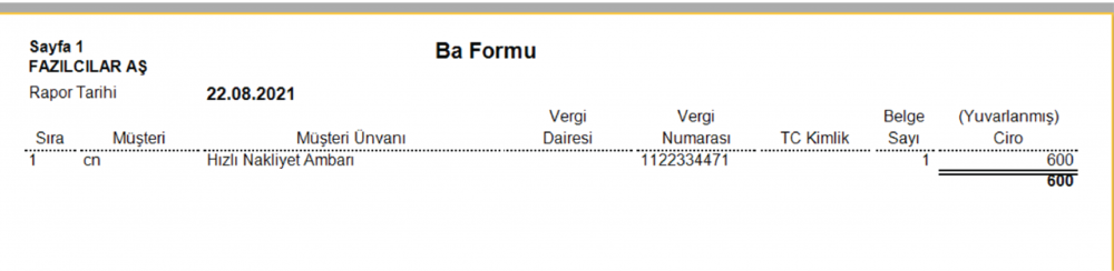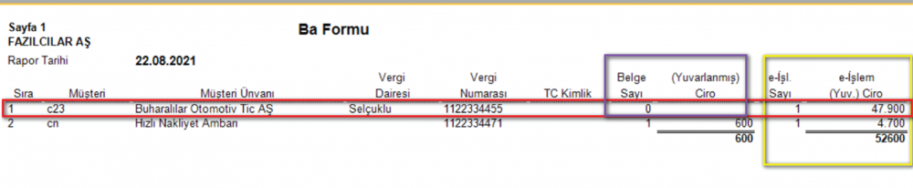 Daha önceki örnekte sadece “Hızlı Nakliyet Ambarı” cari hesabı gözüküyordu. Bu seferkli listede ayrıca “Buharalılar Otomotiv” de rapor çıktısında gözükmektedir. Bunun nedeni anılan cari hesabın tüm belgelerinin e-işleme tabi olması ve “sadece e-işlem dışı” istenince bu cari hesaba ait uygun kayıt bulunamamasındandır. Bu açıklamadan da anlaşılacağı üzere bir firma 5.000 tl ciro sınırını geçse bile tüm belgeleri e-işleme tabi ise GİB’e bildirilen Ba/Bs beyannamelerinde gösterilmeyecektir.
