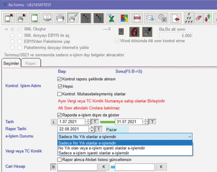 Ba/Bs Formlarında e-İşlem kontrolu Ek olanaklar