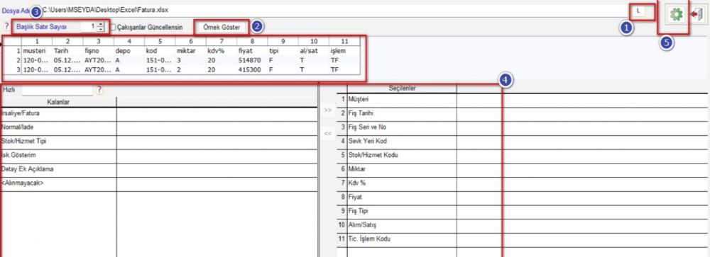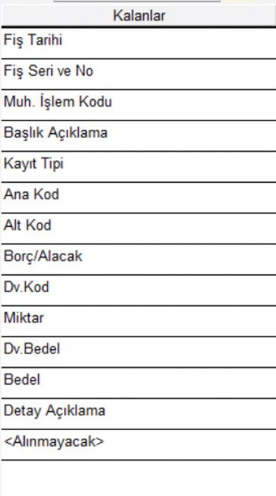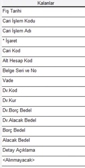 4-) Seçilen sahalar, Excel kolonlar sırasına uygun olmalıdır. (Örnek olarak gösterilen sahalara uygun olmalıdır). Excel’de alınmayacak bir saha varsa o saha için “<Alınmayacak>” sahası seçilir.