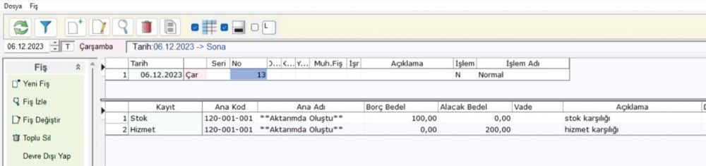 (Örnek: Fatura işlemi, 20.Ocak.2023 tarih ve Borç kaydı olan kayıtlar tek bir fişe konur).