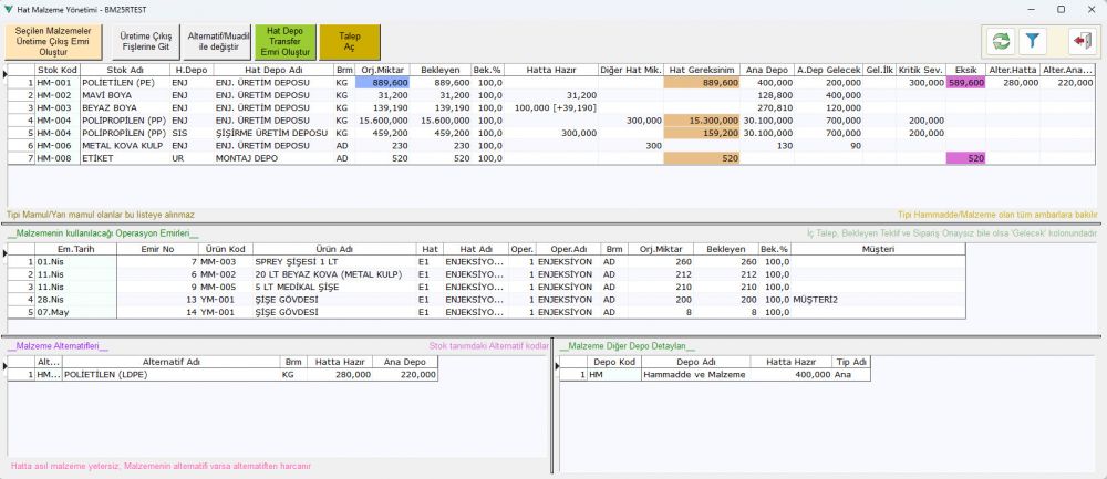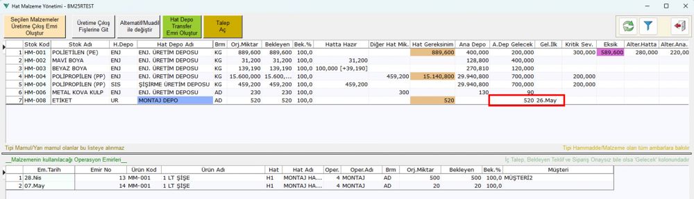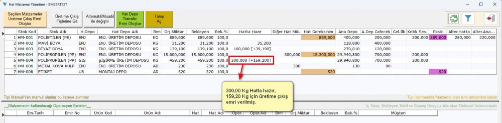 Hat Gereksinim: Hatta hazır halde bulunan malzeme miktarı ve diğer hatlardaki malzeme miktarının toplamı bekleyen miktardan düşük ise aradaki fark kadar hat gereksinimi ortaya çıkar. Gereksinim var ise turuncu renk ile vurgulanır. Hat deposuna malzeme transfer edilmelidir.
