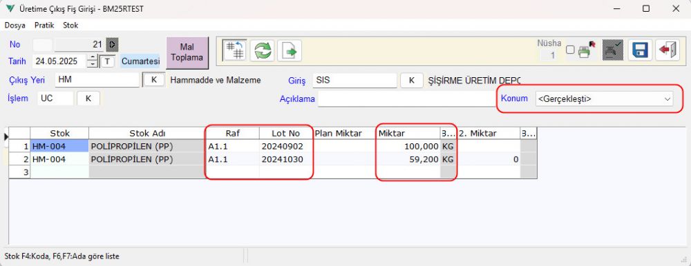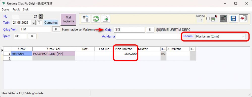 Örnek olarak Şişirme Üretim Deposunda 159,200 KG gereksinimi olan HM-004 POLİPROPİLEN için Üretime Çıkış işlemleri yapılacaktır.