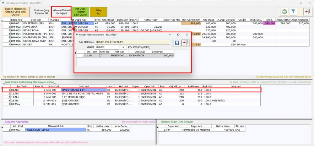 Örnekte 7 numaralı iş emrine ait Enjeksiyon operasyon emrinde alternatif malzeme kullanımı sağlanmıştır.