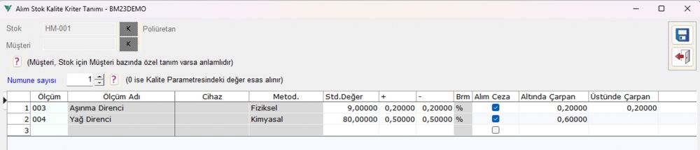 Stoklar için Alım Stok Kalite Kriter tanımları yapılır. Kalite ölçüm değerlerinin tolerans aralıkları verilir. Ceza uygulaması yapılacak ölçümler için “Alım Ceza” kutucuğu işaretlenir.