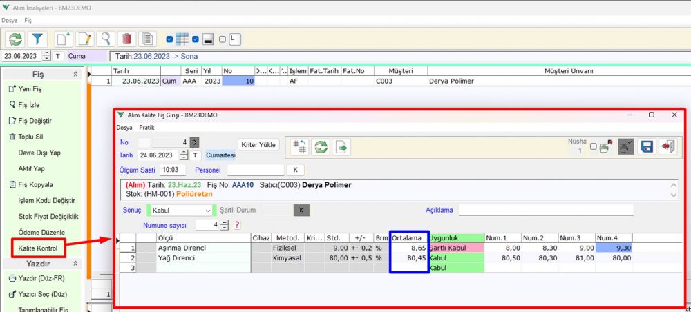 İrsaliyenin Kalite Ölçüm verileri girilir. Ölçüm verileri girildikten sonra Ölçüm Ortalama Değeri ortaya çıkar.