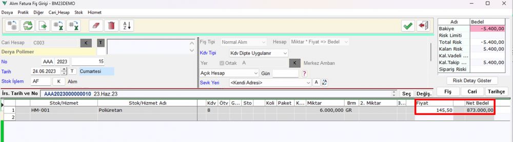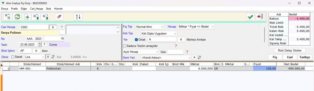Aşağıdaki örnekte ceza tanımları yapılmış bir stok için alım irsaliyesi üzerinden konu anlatılmıştır.