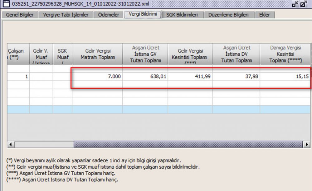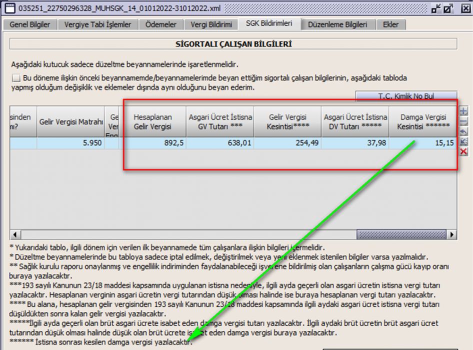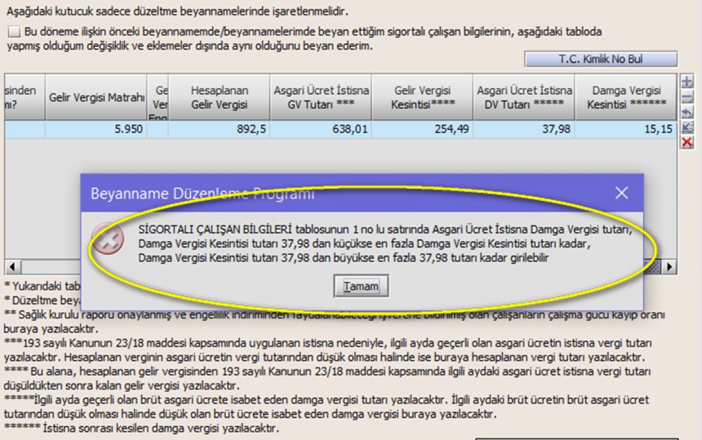 Öte yandan e-Beyanname programının 03.Şubat.2022 itibariyle Sigortalı çalışan bilgilerindeki en son “Damga Vergisi Kesintisi” için açıklama olarak “İstisna sonrası kesilen damga vergisi yazılacaktır” diye yazmasına rağmen Beyanname kaydı anında bazen bir uyarı mesajı çıkmaktadır.